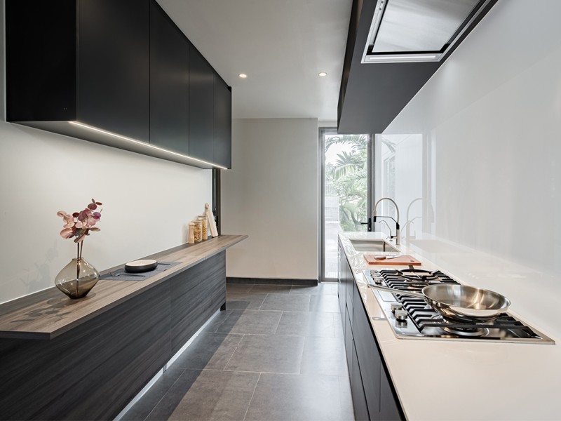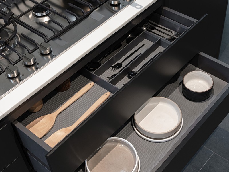 วิธีนี้ช่วยลดงานรื้อ–ดัดแปลงที่ไม่จำเป็น และทำให้ครัวบิวท์อินสอดคล้องกับการใช้งานจริง ขณะเดียวกัน ผังภายในของตู้ เช่น ลิ้นชัก รางดึง และชั้นวาง ยังปรับรูปแบบได้ตามนิสัยการทำอาหารของแต่ละบ้าน